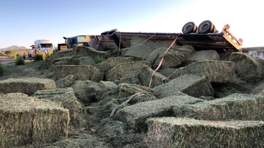 Los hechos ocurrieron a la altura del kilómetro 11 + 700 de la vía corta Juárez a Chihuahua, donde el conductor de un tráiler de plataforma que cargaba varias pacas de pastura se reventó una banda de la carga.