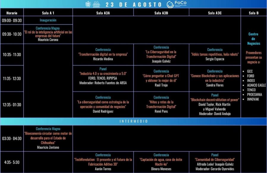 Chihuahua, Chih..- Continuando con la visión del alcalde Marco Bonilla de hacer una ciudad más competitiva, el Gobierno Municipal participa como patrocinador en la 27 edición del Foro de Competitividad 2023, organizado por el Centro de Competitividad de Chihuahua, el cual arrancó este miércoles 23 y se extenderá hasta mañana jueves 24 de agosto en el Centro de Convenciones, con la participación de conferencistas de interés nacional e internacional con temas de tecnología e innovación.
