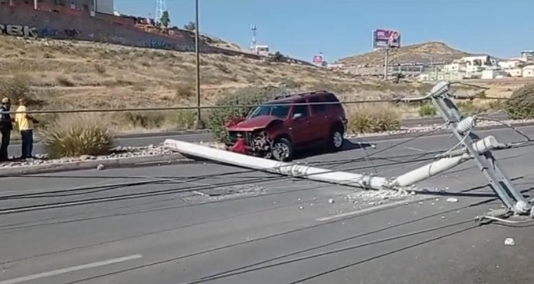 Chihuahua, Chih.- Una camioneta impactó contra un poste de luz derribándolo y dejando enormes daños materiales en la avenida Vía Sicilia.