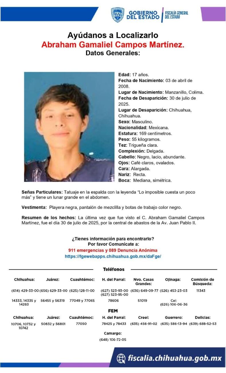 Chihuahua, Chih.– Abraham Gamaliel Campos Martínez, un adolescente de 17 años, fue reportado como desaparecido desde el 30 de julio en la ciudad de Chihuahua. Sus familiares solicitan el apoyo de la comunidad para dar con su paradero.