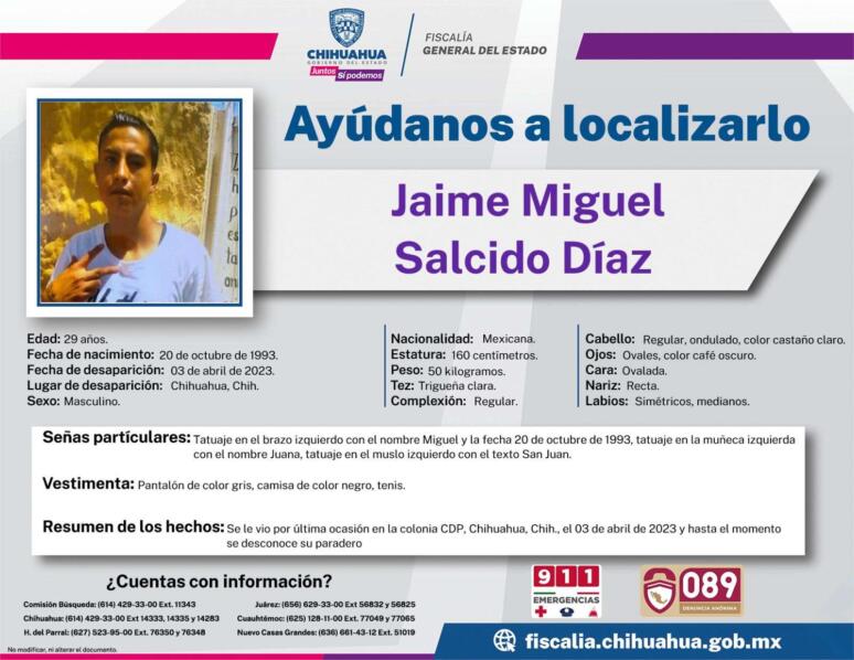 El otro ausente se llama Jaime Miguel Salcido Díaz, de 29 años de edad.