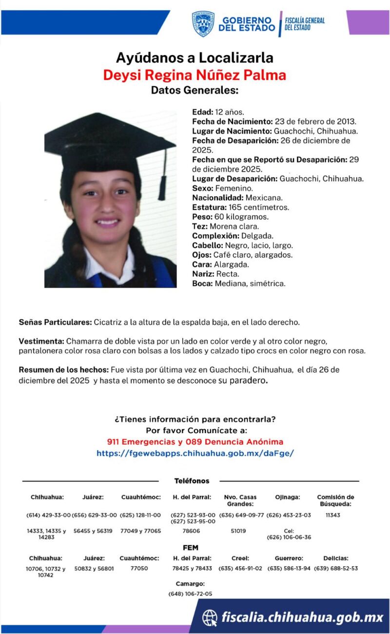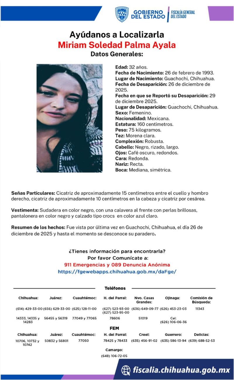 Guachochi, Chih.– La Fiscalía General del Estado emitió una ficha de búsqueda para Míriam Soledad Palma Ayala y su hija Deysi Regina Núñez Palma, quienes fueron reportadas como desaparecidas desde el pasado viernes 26 de diciembre en el municipio de Guachochi, Chihuahua.