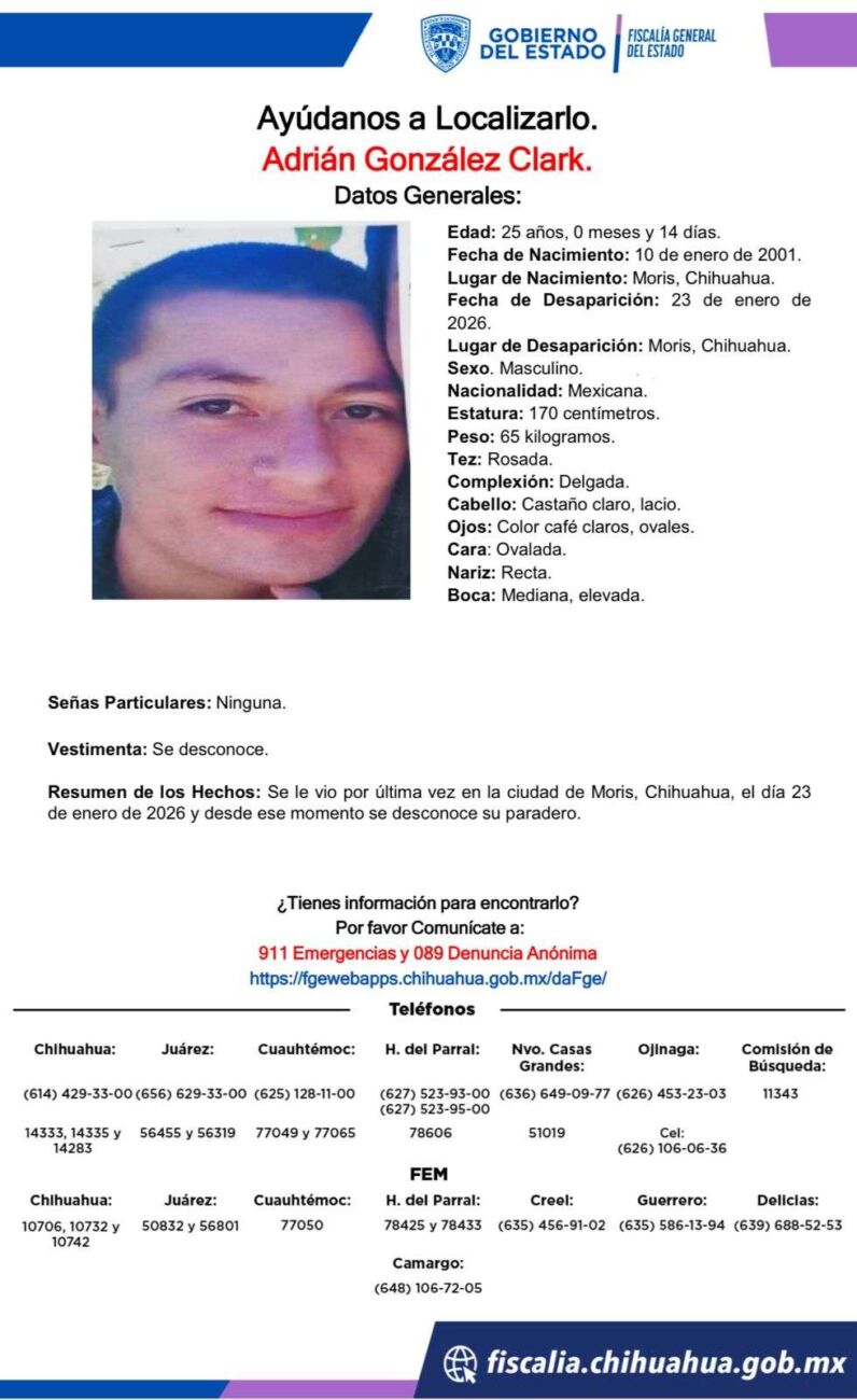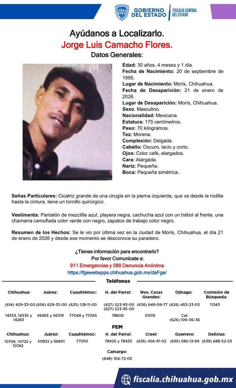De acuerdo con la autoridad, el miércoles pasado fue reportada la desaparición de Jorge Luis Camacho Flores, de 30 años de edad, quien fue visto por última vez en Moris.