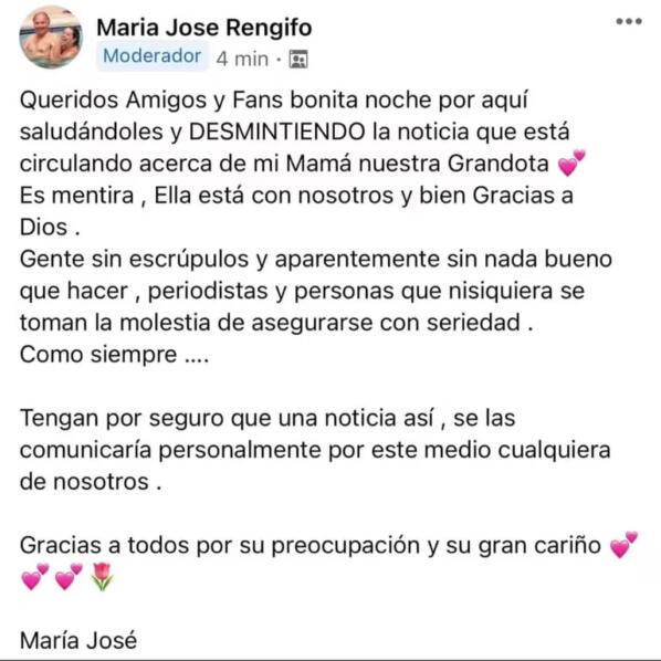 Queridos amigos y fans, bonita noche. Por aquí saludándolos y desmintiendo la noticia que está circulando acerca de mi mamá, nuestra Grandota. Es mentira, ella está con nosotros y bien, gracias a Dios.