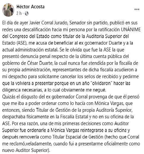 El día de ayer Javier Corral Jurado, Senador sin partido, publicó en sus redes una descalificación hacia mi persona por la ratificación UNÁNIME del Congreso del Estado como titular de la Auditoria Superior del Estado (ASE), me acusa de beneficiar al ex gobernador Duarte y a la actual administración estatal.