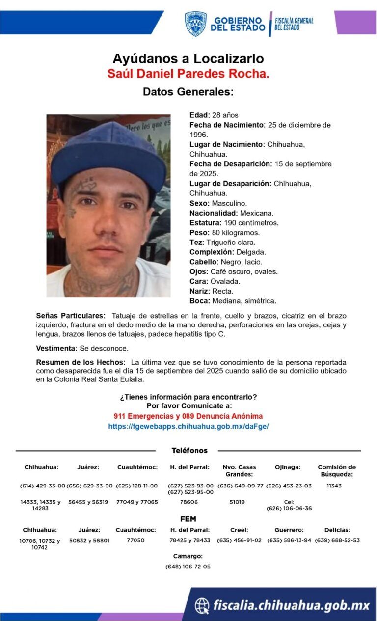 Chihuahua, Chih.- La Fiscalía de la Zona Centro identificó como Saúl Daniel Paredes Rocha, de 21 años, al hombre cuyo cuerpo mutilado fue localizado dentro de una maleta y un plástico en un predio baldío ubicado en el cruce de Rodolfo Cao Zamudio y Garcilazo de la Vega, en la colonia Chihuahua 2000.