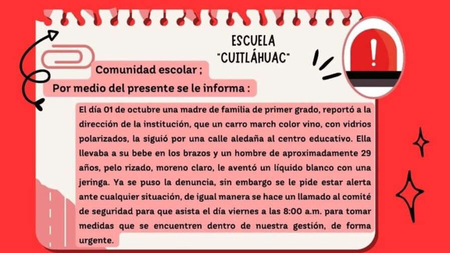 El caso fue difundido en redes sociales y replicado por personal de la primaria federal Cuitláhuac, ubicada en el sector de Las Torres, para alertar a la comunidad escolar y convocar a un comité de seguridad con el fin de tomar medidas preventivas.