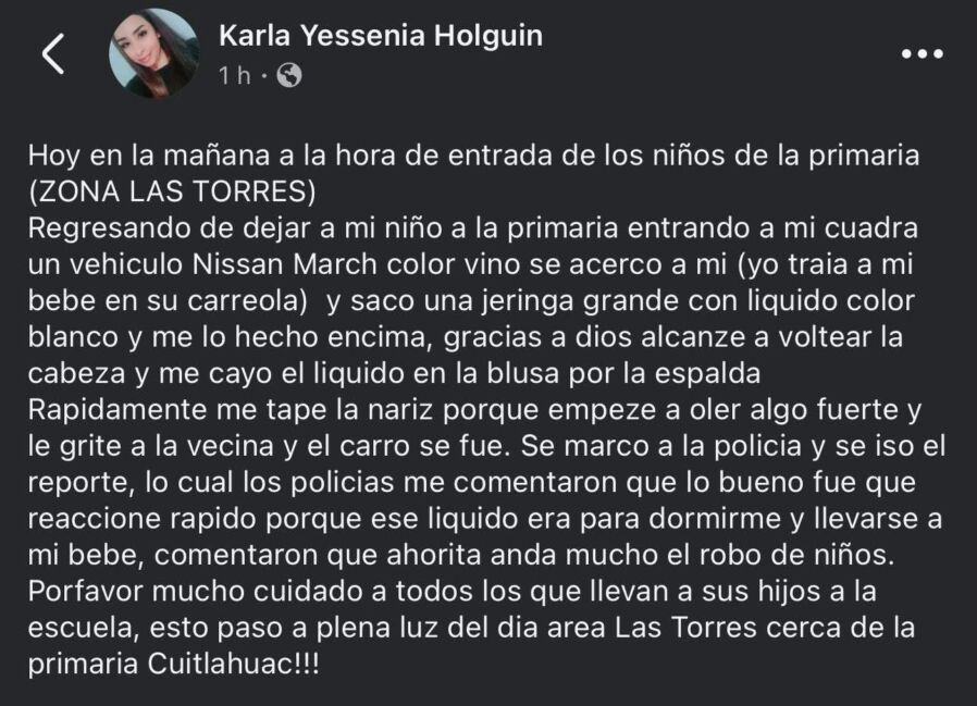 De acuerdo con su testimonio, un vehículo Nissan March color vino se le acercó y uno de los ocupantes le arrojó un líquido blanco desde una jeringa. La mujer relató que alcanzó a girar la cabeza y el líquido le cayó en la blusa mientras empujaba la carreola donde llevaba a su bebé.