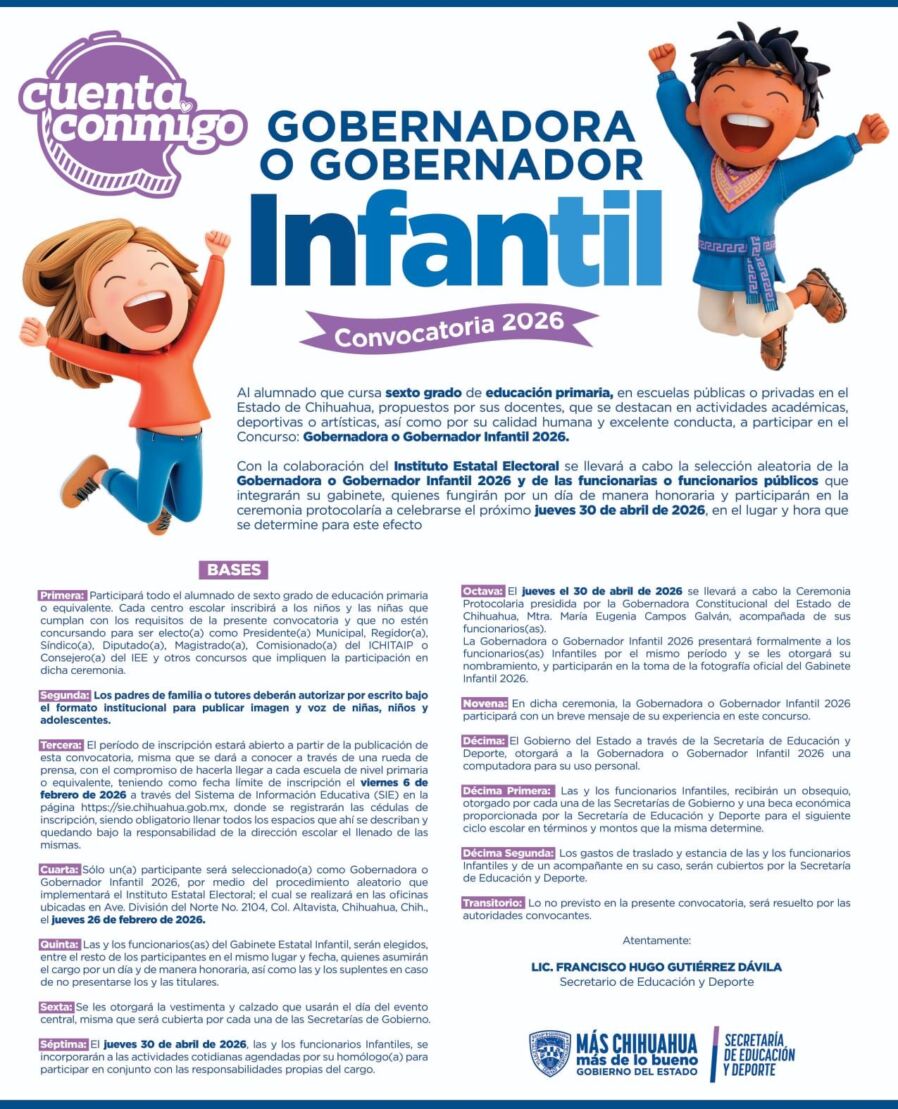 Chihuahua, Chih.- Con el propósito de promover los valores cívicos y la participación democrática de la niñez, el Gobierno del Estado a través de la Secretaría de Educación y Deporte (SEyD), llevará a cabo el Concurso “Gobernador Infantil 2026”.