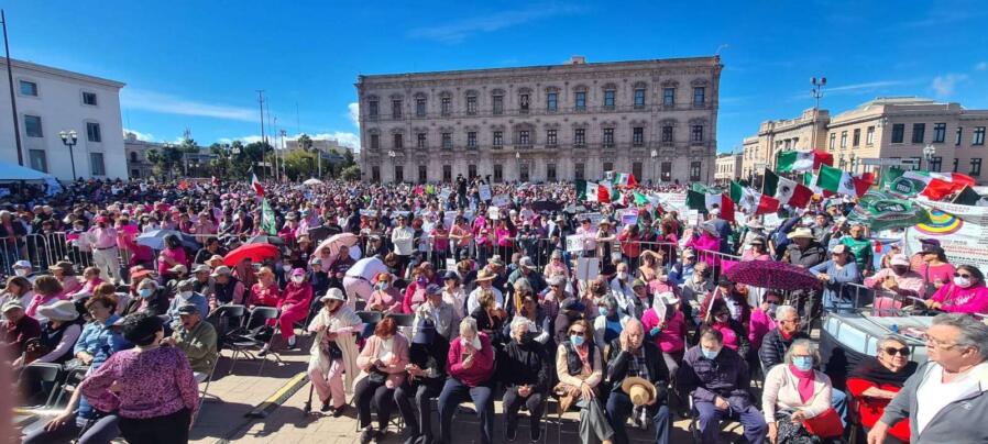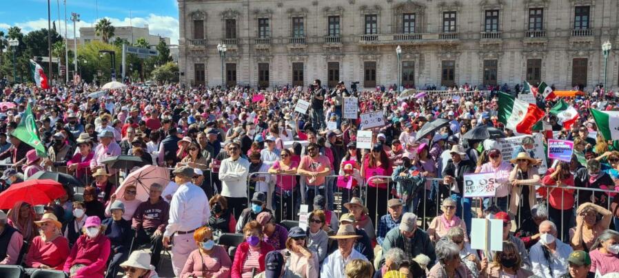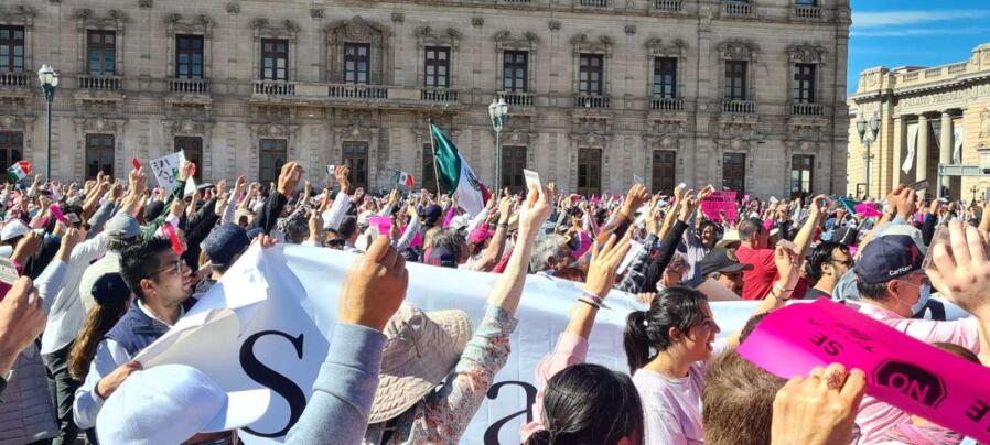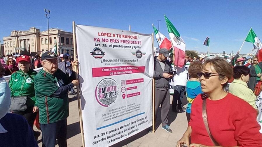 Chihuahua, Chih.- Cientos de personas se congregaron la mañana de este domingo en la Plaza del Ángel en defensa de la autonomía del INE.