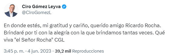 “En donde estés, mi gratitud y cariño, querido amigo Ricardo Rocha. Brindaré por ti con la alegría con la que brindamos tantas veces. Qué viva «el Señor Rocha» CGL”, escribió.