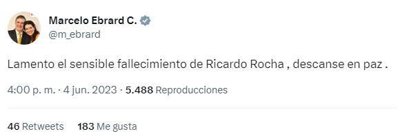 El titular de la Secretaría de Relaciones Exteriores, Marcelo Ebrard, lamentó, a través de redes sociales, la muerte del periodista Ricardo Rocha.