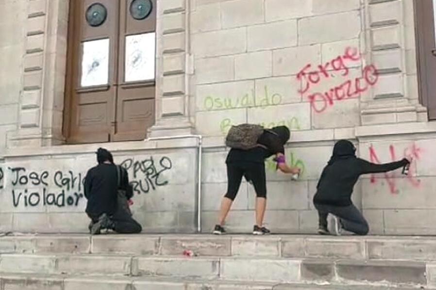 Los grupos de agitadoras con el rostro cubierto que se infiltraron en el contingente, continuaron rompiendo cristales en locales diversos a su paso, pintaron con aerosol mensajes de protesta sobre muros, puertas y ventanas. Poco antes de las 18:00 horas, el grupo se dispersó para participar en un mitin en la Plaza Mayor.
