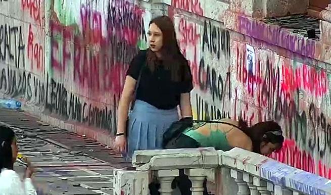 Los grupos de agitadoras con el rostro cubierto que se infiltraron en el contingente, continuaron rompiendo cristales en locales diversos a su paso, pintaron con aerosol mensajes de protesta sobre muros, puertas y ventanas. Poco antes de las 18:00 horas, el grupo se dispersó para participar en un mitin en la Plaza Mayor.
