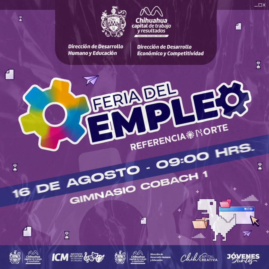 Chihuahua, Chih.- Siguiendo con la encomienda del alcalde Marco Bonilla de generar espacios para el crecimiento de las y los jóvenes, el Gobierno Municipal invita a la próxima Feria de Empleo Joven, este miércoles 16 de agosto de las 09:00 a 17:00 horas en el Gimnasio del Colegio de Bachilleres, plantel 1.
