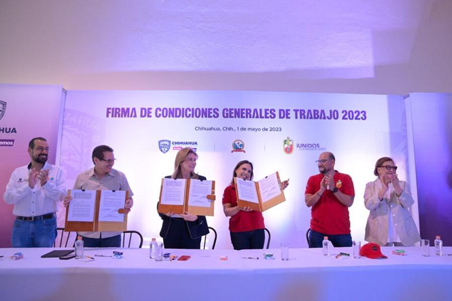 Chihuahua, Chih.- En el marco de los festejos por el Día del Trabajo, la Gobernadora Maru Campos firmó el Pliego Petitorio del Sindicato de...