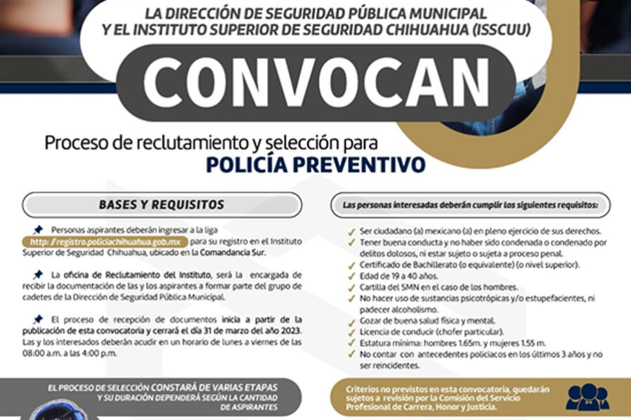 Chihuahua, Chih.- La Dirección de Seguridad Pública Municipal (DSPM) invita a mujeres y hombres con vocación de servicio hacia su comunidad, a registrarse en...