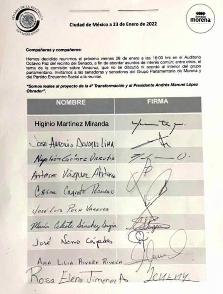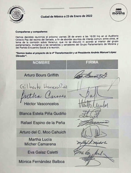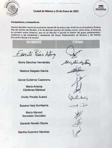 Los senadores que firman el acuerdo para reunirse el próximo viernes son César Cravioto, Antares Vázquez, José Narro, Malú Micher, Nestora Salgado, Higinio Martínez, Susana Harp, José Antonio Álvarez Lima, Napoleón Gómez Urrutia, Ana Lilia Rivera, Mónica Fernández y Héctor Vasconcelos.
