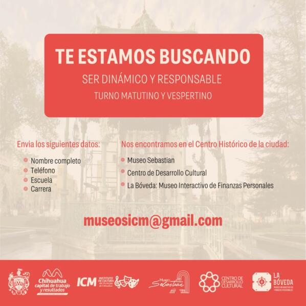 Chihuahua, Chih.- El Instituto de Cultura del Municipio (ICM) a través de la Coordinación de Museos anuncia la convocatoria para prestadores de servicio social en los diferentes espacios museísticos. Esta iniciativa busca fomentar habilidades en los jóvenes como trabajo en equipo, participación social, promoción y difusión.