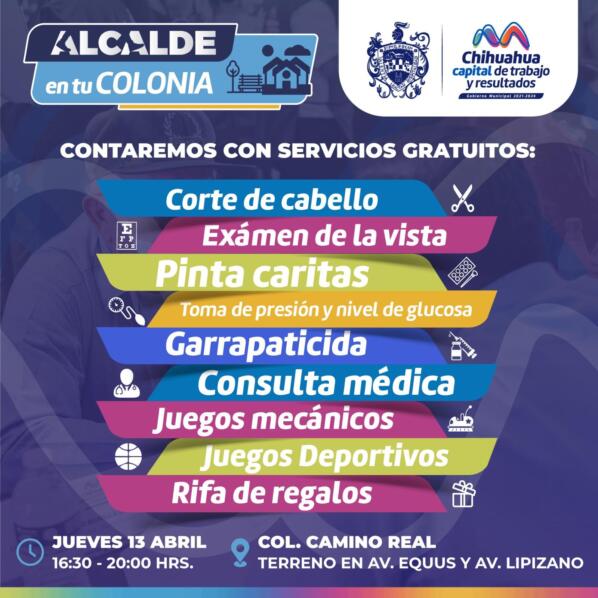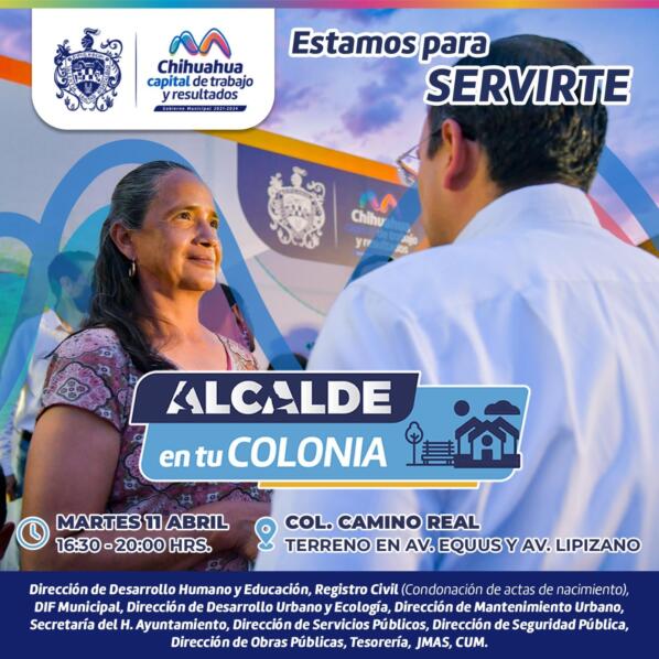 Chihuahua, Chih.- Los días 11 y 13 de abril, el alcalde Marco Bonilla y todos los directores del Gobierno Municipal, estarán atendiendo las gestiones y solicitudes de las familias que habitan en la colonia Jardines de Oriente, Punta Oriente, Camino Real y alrededores con el programa “Alcalde en tu Colonia” organizado por la Dirección de Desarrollo Humano y Educación en un horario de 16:30 a 20:00 horas.
