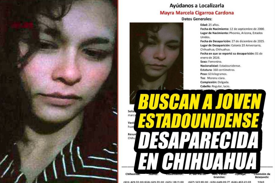 Chihuahua, Chih.– Autoridades solicitan el apoyo de la ciudadanía para localizar a Mayra Marcela Cigarroa Cardona, de 25 años de edad y nacionalidad estadounidense,...