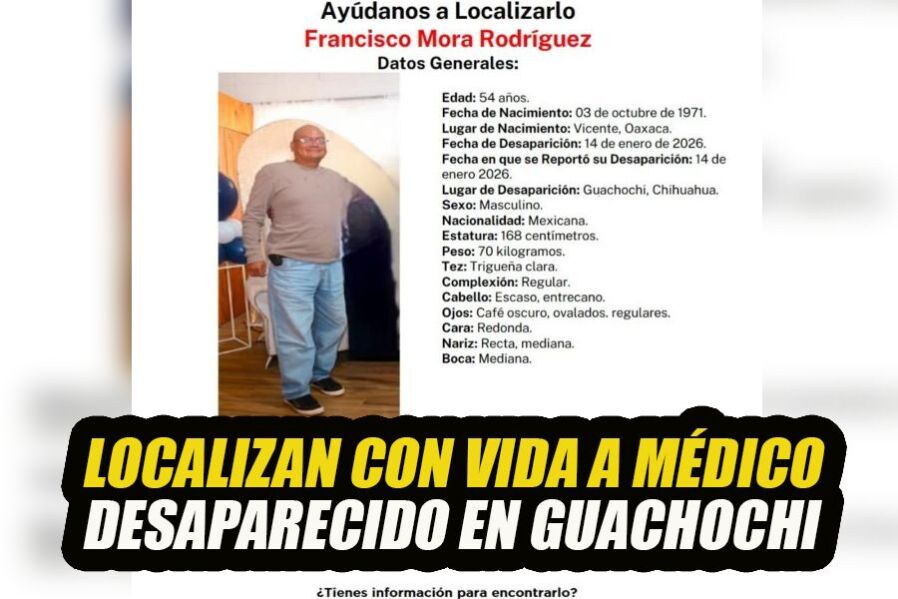 Guachochi, Chih.- El doctor Francisco Mora Rodríguez, de 54 años, fue localizado con vida luego de haber sido reportado como desaparecido desde el pasado 13 de...