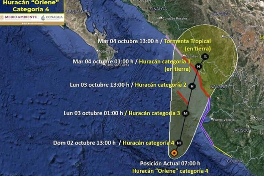 MÉXICO.- El centro del huracán “Orlene”, de categoría 4 en la escala Saffir-Simpson, se localiza a 170 km al suroeste de Cabo Corrientes y...