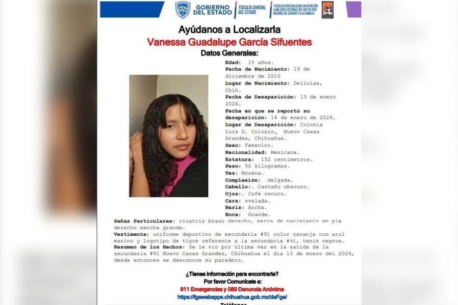 Nuevo Casas Grandes, Chih.- Autoridades de Nuevo Casas Grandes solicitaron el apoyo de la ciudadanía para localizar a una adolescente de 15 años, identificada...